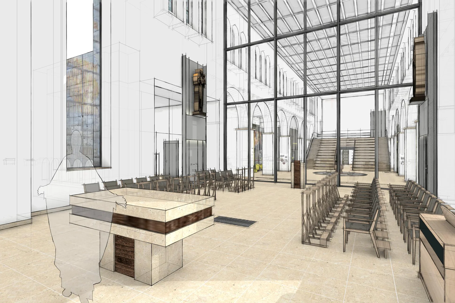 In der jetzigen Baumaßnahme wird der sakrale Bereich verkleinert werden und es wird eine Nutzungsänderung vorgenommen – das Kirchenschiff wird in diesem Zuge einen didaktischen Bereich erhalten. Weiterhin werden Bereiche für Veranstaltungen geschaffen, sowie Räumlichkeiten, die sozialen Einrichtungen zur Verfügung gestellt werden können inkl. Funktionsräumen (wie Küche und WCs). Planung der Abwasserleitungen und der Abwasserhebeanlage, Trinkwasser, Saniäranlagen, Heizung mit 2 Wärmepumpen mit einer maximalen Heizleistung von 75kW , Pufferspeicher mit 2000l Puffervolumen, und 3 Pumpengruppen, Wärmeverteilnetzte, Raumheizflächen, Lüftungsgeräte, Allgemeine Elektrotechnik mit NSHV, Niederspannungsinstallationsanlagen, Beleuchtung, Sicherheitsbeleuchtung, Außenbeleuchtung, Nachrichtentechnik, audiovisuelle Medien– und Außenanlagen, Brandmeldeanlage, Datenübertragungsnetzte.